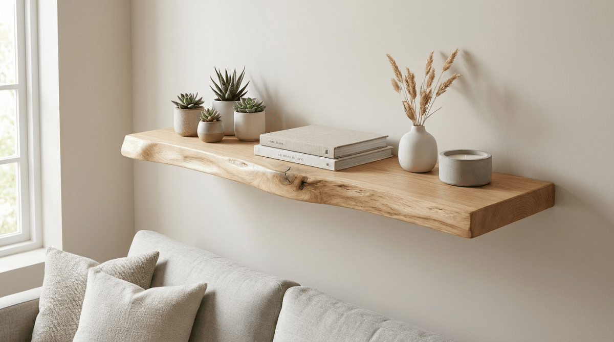 With its mix of clean lines and natural irregularity, White Oak live edge shelving works beautifully in modern, rustic, Scandinavian, coastal, and transitional interiors. These shelves bring depth, texture, and authentic hardwood character to any space, creating a floating installation that feels warm, architectural, and visually distinctive.