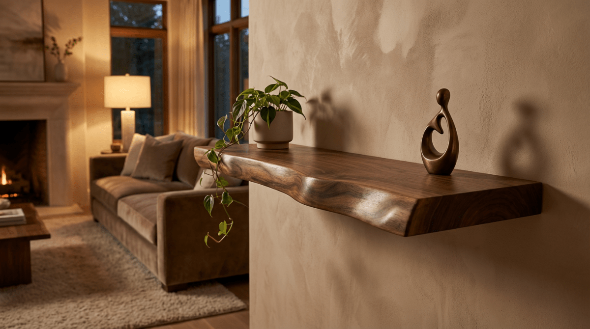 Our Walnut live edge floating shelves highlight the deep, warm tones and flowing grain patterns that make Walnut one of the most valued American hardwoods. Each shelf features an individually sculpted live edge, preserving the tree’s natural contours for a shelf that feels both refined and organically expressive.
